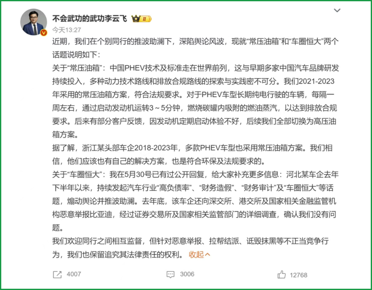 比亚迪李云飞在6日的论坛上先声夺人,他直言国内有些车企“又蠢又坏”,还喜欢在发布会上“阴阳”“拉踩”友商。李云飞表示,“汽车行业有的不是用孙子兵法,用的是厚黑学,有的人是又坏又蠢。真心诚意做技术做品牌的企业对这些是深恶痛绝的。”随后,他也在微博回应了舆论热议的问题。