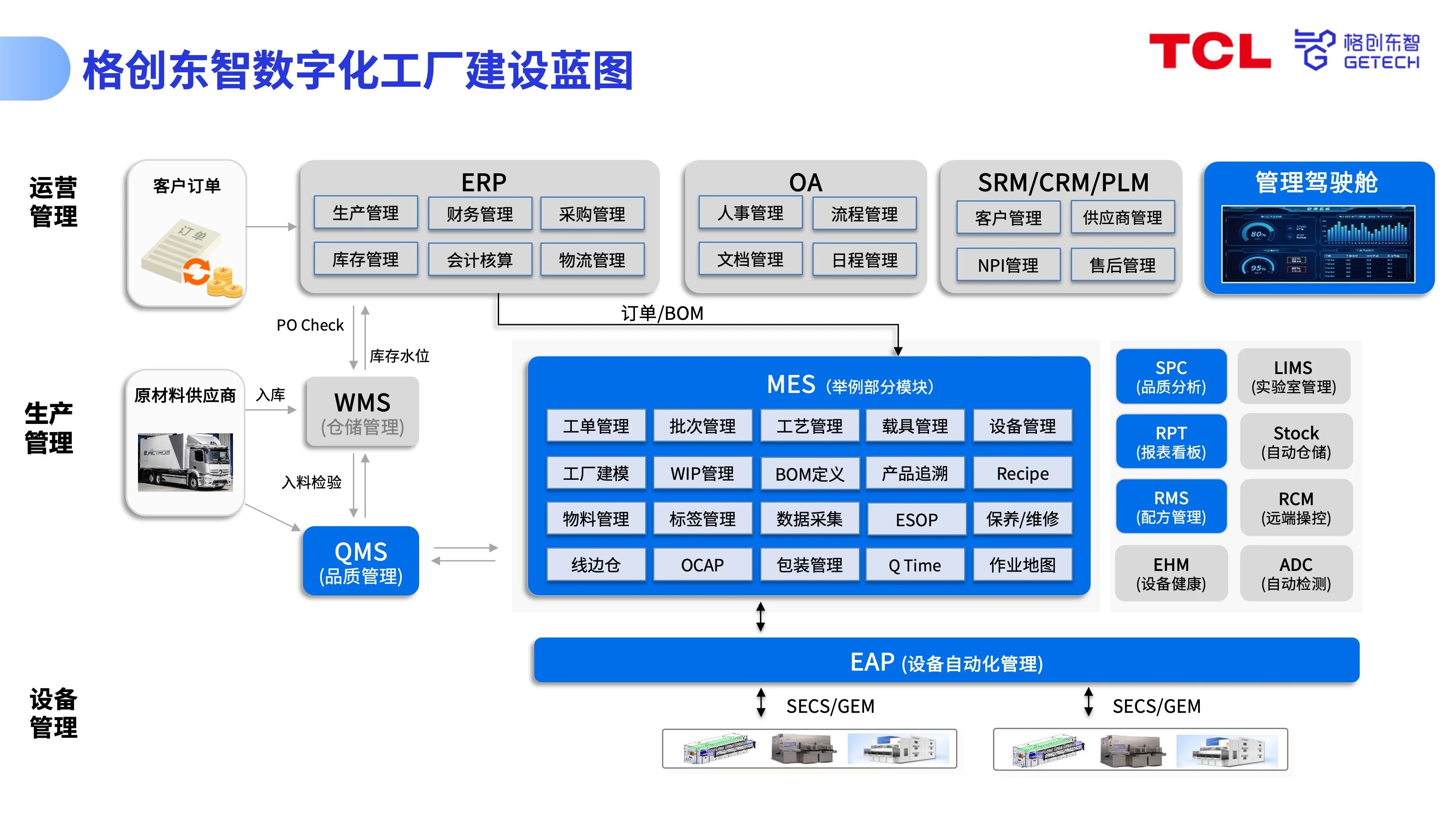 CIM是保障半导体有序生产的核心系统,由数十种软件模块组成,被称为制造的“大脑”和工厂的“神经网络”,贯穿产品整个生命周期。格创东智将紧贴客户需求与生管KPI,帮助企业实现生产流程信息化、设备自动化、品质管理全员化,在提升产品良率和生产效率的同时,完成工厂管理智能化提升。