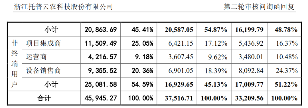 托普云农表示,报告期各期,公司向非终端用户的销售占比分别为51.22%、45.13%和54.59%。