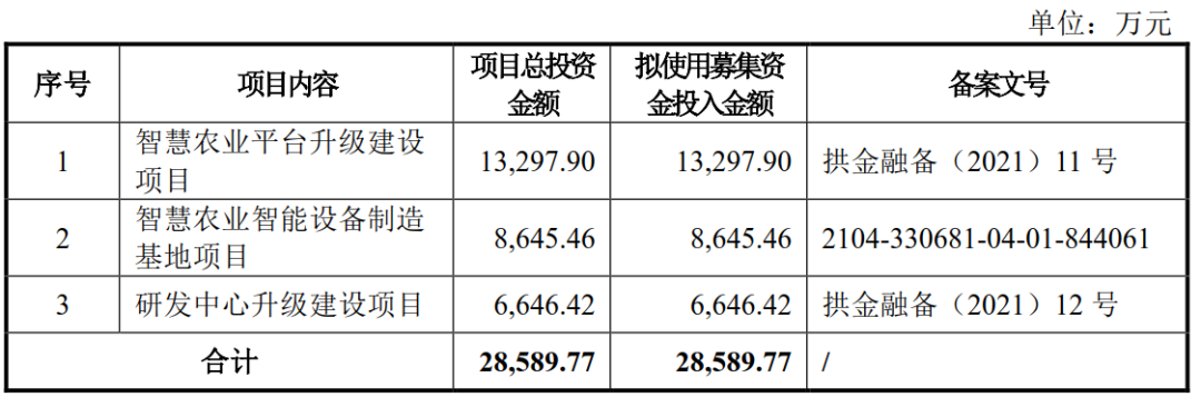 公司此次公开发行股票并在创业板上市,拟募集28,589.77万元,分别用于“智慧农业平台升级建设项目”13,297.90万元;用于“智慧农业智能设备制造基地项目”8,645.46万元;“研发中心升级建设项目”6,646.42万元。