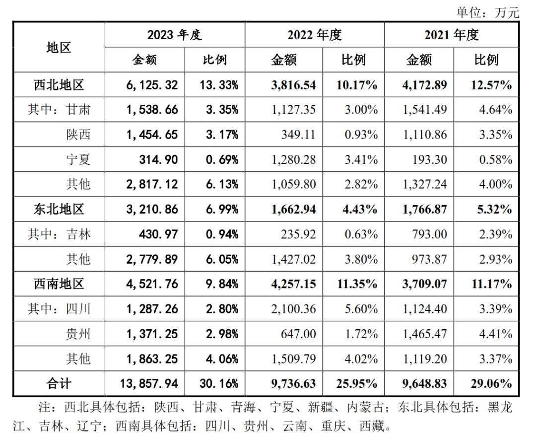 报告期内,西北、东北、西南区域内,公司各期主营业务收入主要来源于西北地区的甘肃、陕西和宁夏,东北地区的吉林,西南地区的四川和贵州,销售内容方面,公司向上述西北、东北、西南等地区客户销售的产品主要应用于全国农作物病虫害监测点、耕地质量监测点、种子检测分中心等项目,是国家重点支持建设的智慧农业项目。