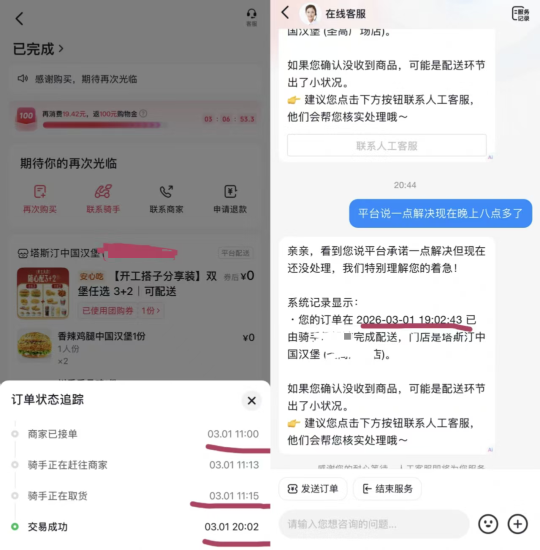 胡雪之前就碰到一次配送事故,后来她就再也没用过抖音外卖了。“中午11点下单的午饭,12点40都没到,打电话说13点客服联系解决,等到晚上八点多了,没看到外卖也没客服联系,结果订单显示晚上七点多配送完成了,也没有渠道可以申请退款,太坑了。”