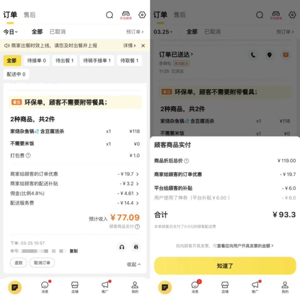 美团商家张启明表示,“店里卖98元的杂鱼锅,上了外卖顾客用券实付93.3元,自己到手才77元,现在房租居高不下,各种团购的推广费和补贴都是商家自掏腰包占大头,其实抖音要是能减免抽成让我们有钱赚,谁又会拒绝呢?”