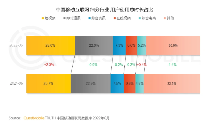 首先,字节系拥有的已经是目前在国内用户时长占用最高的业务,QuestMobile的数据显示,短视频已经连续两年在用户时长上超过即时通讯,如果算上占据时长老三的“资讯”,那抖音已经在时长上稳压腾讯的“微信互联网”。