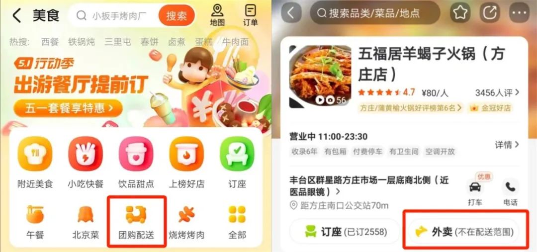 据光子星球了解,当前美团仅在北京、上海上线了“团购配送”入口,其他城市日前还并未开通。业务入口在团购到店商家主页的“订座”位置旁边增加了“外卖”。