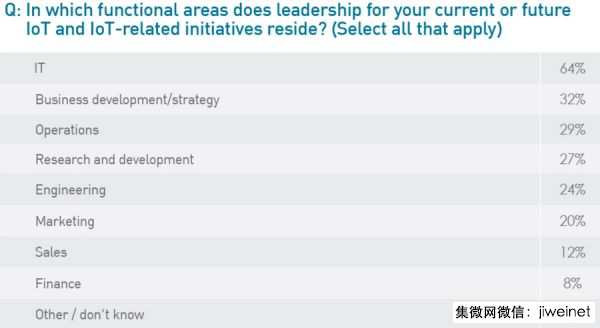 ↓以专案重点而言,最多比例(30%)的受访者表示是在分析、资料管理及基础架构等科技,其次为产品及服务(24%),营运(17%)、客户服务(16%)及员工生产力(9%)。这也说明了,何以在六成以上(64%)的企业中,IoT专案是由IT部门主导。由业务开发、营运及研发部门主导的比例各在三成左右。仅20%及12%的IoT主导权落在行销及业务部门。