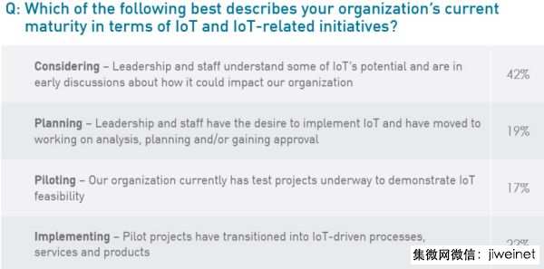 这项调查针对200多名IT及业务主管进行的调查指出,目前已经计画导入IoT,并开始分析、规划及取得上级许可的比例为19%,已经开始IoT测试专案的有17%,比例并不高,但表示测试专案在公司内部已经转化为IoT驱动的流程、服务和产品的受访者,则已来到22%。(如下图,来源:TEKsystems)