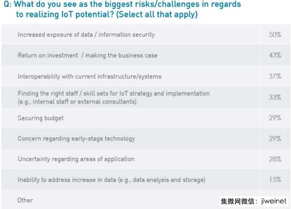 ↓受访企业对IoT的最大风险或挑战,50%认为是曝露于资安风险,其次是43%认为IoT的投资回报,37%担心与现有IT架构的整合度。(图表来源:TEKsystems)
