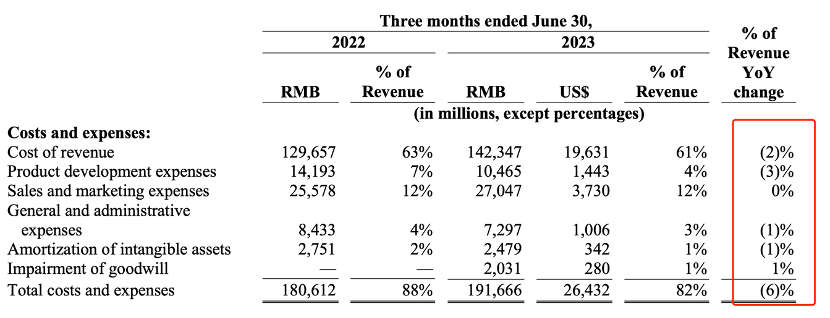 如今我们回望这些业务,成功和失败各有比例,正面和负面结果都有(正向刺激市场信心,而负面则很大程度上恶化了损益表,反而又丢掉了资本市场对其信心),但重金投资的业务更多还是对未来的信心。2023年Q2资本性支出69.27亿元,上年同期则为118.43亿元,此数据结合上图结果不言自明。