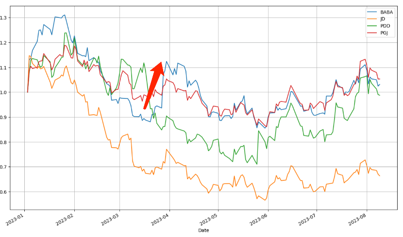 我们整理了2023年以来,阿里,京东和拼多多以及金龙指数的股价波动情况(初始值设为“1”)