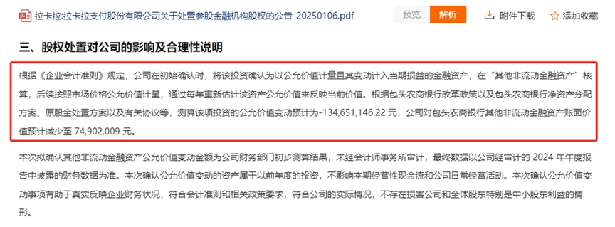 证券之星注意到,今年1月6日,拉卡拉发布公告称决定以退股方式处置所持的包头农村商业银行股份。回溯 2017年,拉卡拉以自有资金2.18亿元认购该行9900万股股份,认购价格为2.2元/股。此后经过几轮扩股,拉卡拉最终持股1.19亿股,持股比例9.88% 。截至1月6日,拉卡拉对包头农商行的其他非流动金融资产账面价值约为2.1亿元。