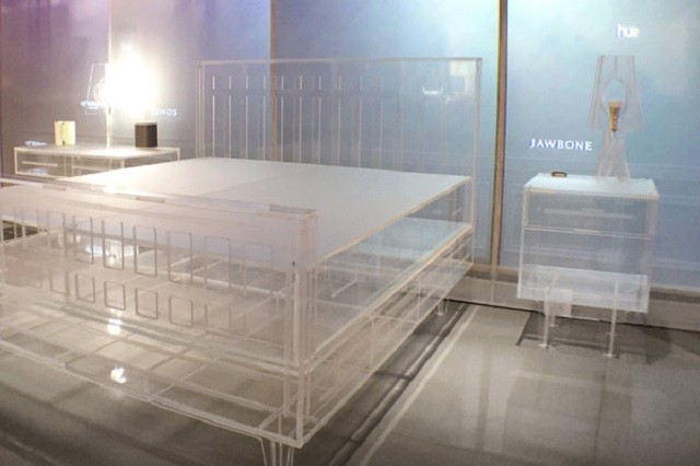 在Target的商店中还有一个卧室展示厅,看上去很像是鬼才设计师Philippe Starck的设计作品,看上去相当地莫名其妙,虽然完全是由磨砂塑料组成,但是居然有一种维多利亚时代女士们会喜欢的复古风。这间展示厅的意义可能是要向我们显示多种产品如何和谐共处(事实上并不能和谐共处,比如说电动汽车充电桩,不同的生产厂家会开发完全不同的技术)。比如说Jawbone手环,它是全民健身运动中的最新宠儿,在这间卧室展示厅中该手环能够发挥的作用就是当你睡下时,它会自动锁门并且关灯。