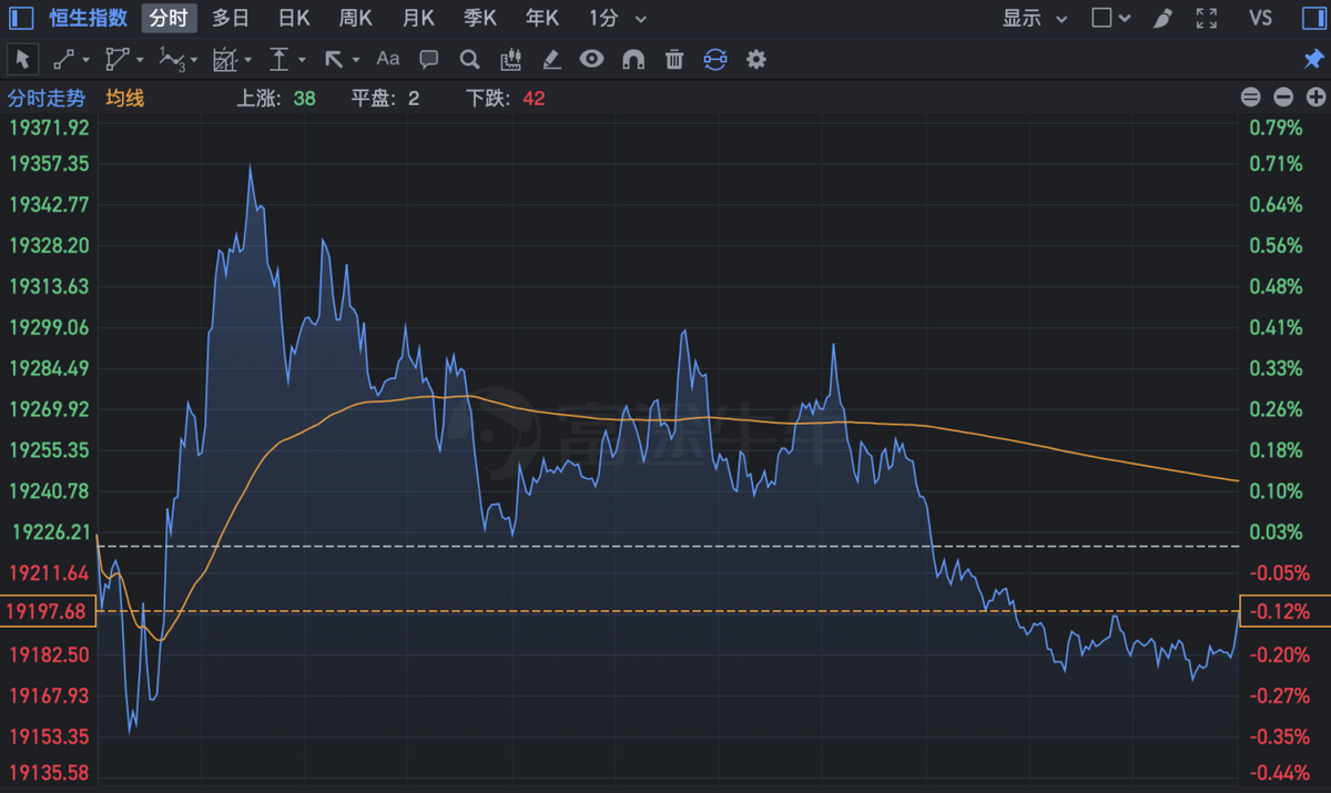 美股隔夜向好,港股今早先跌后反弹,恒指开涨4点报19225点,随后曾倒跌71点低见19149点,触及10日线后掉头回升,临近午盘再度回落走势反复;截至收盘,恒指收跌0.12%,科指收涨0.31%,恒指大市成交额1219亿港元。