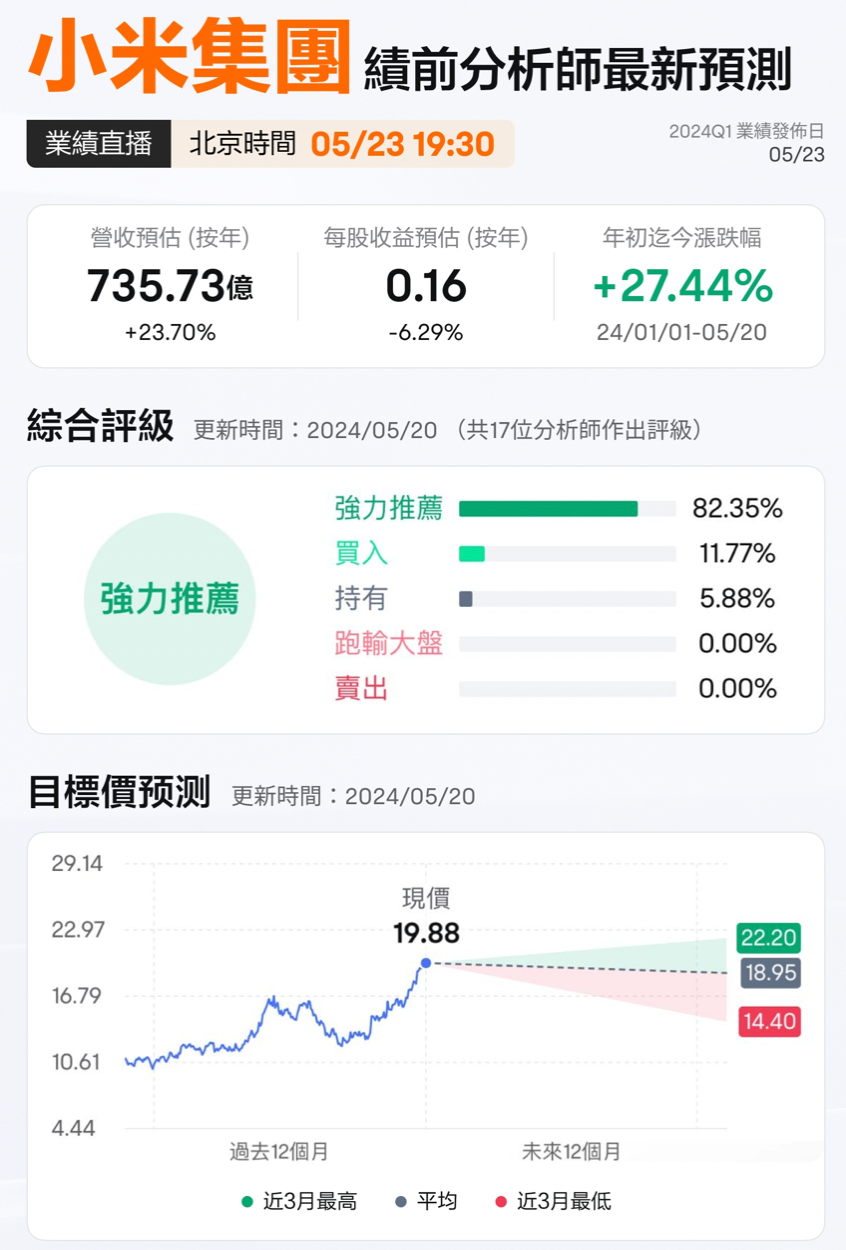 股价高歌猛进之际,小米也迎来了备受市场关注的一季报——最新业绩将于5月23日发布。目前市场普遍预测,小米一季度有望实现营收735.73亿元人民币,同比增长23.7%;每股收益为0.16元,同比下跌6.29%。近期共有17位分析师对该股做出评级,超八成分析师表示“强力推荐”;目前平均目标价为18.95港元,略低于最新收盘价19.88港元。