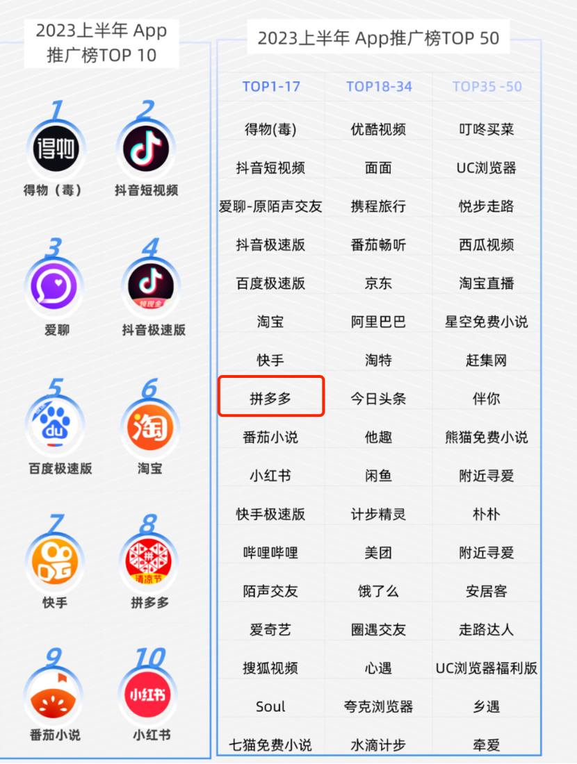 上图为AppGrowing制作的2023上半年App推广排行榜,拼多多从去年同期第二名跌落至第七名,与前文我们的分析也基本吻合。