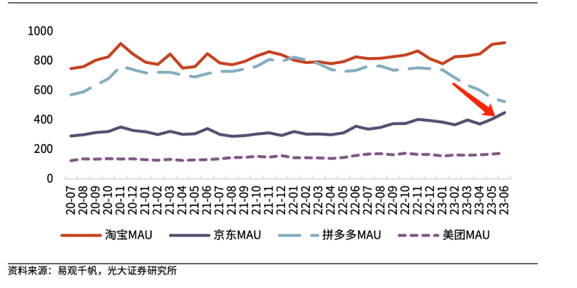 根据光大证券报告,自2023年以来拼多多的MAU确实经历了明显的下行,与此同时淘宝MAU则有了一次明显提振,行业已经是彻底的零和博弈。很显然,对拼多多就有了如下反应链条:出海业务大额投入——为平衡最终损益表,削减原业务支出——获客效率降低,加之对手进攻,影响总用户。