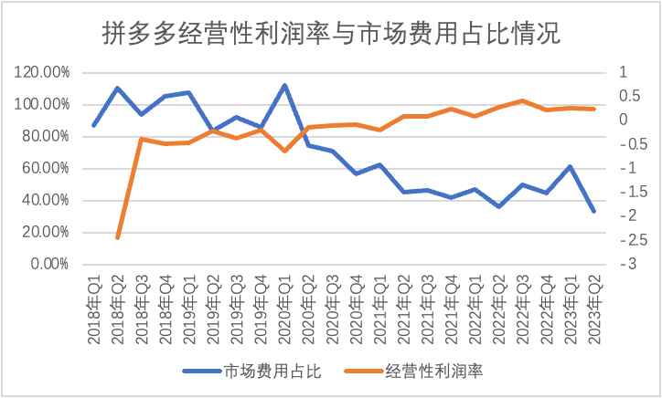 市场费用曾经是拼多多最受争议的期间费用,在上图中我们可以非常直观看到,在企业创立之初,市场费用吃掉了拼多多绝大多数毛利(主要为买量),导致企业连年巨额亏损,2021年之后,市场费用占营收比开始跌破50%,在2023年Q2甚至跌至30%附近,结果也显而易见,市场费用收缩直接改善了盈利条件,经营性利润率开始持续好转。