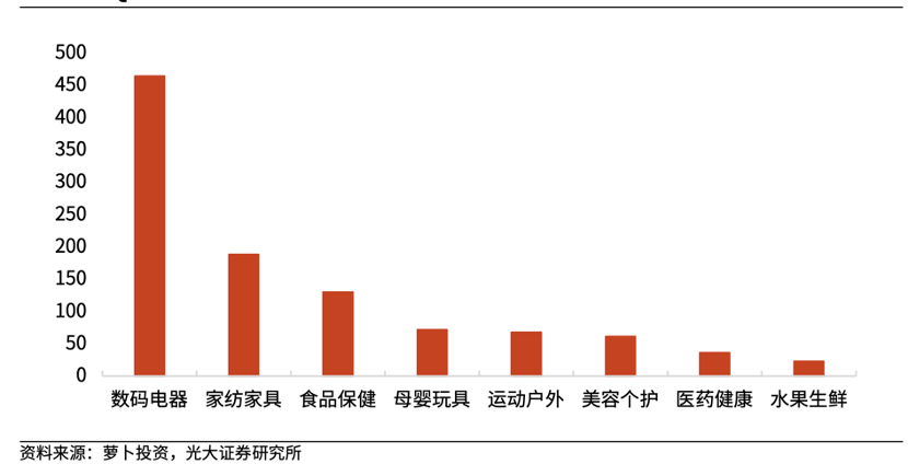 上图为光大证券整理的2023年Q2拼多多分品类销售额(亿元),非常值得注意的是数码家电和家纺家具开始成为平台的绝对主力品类。