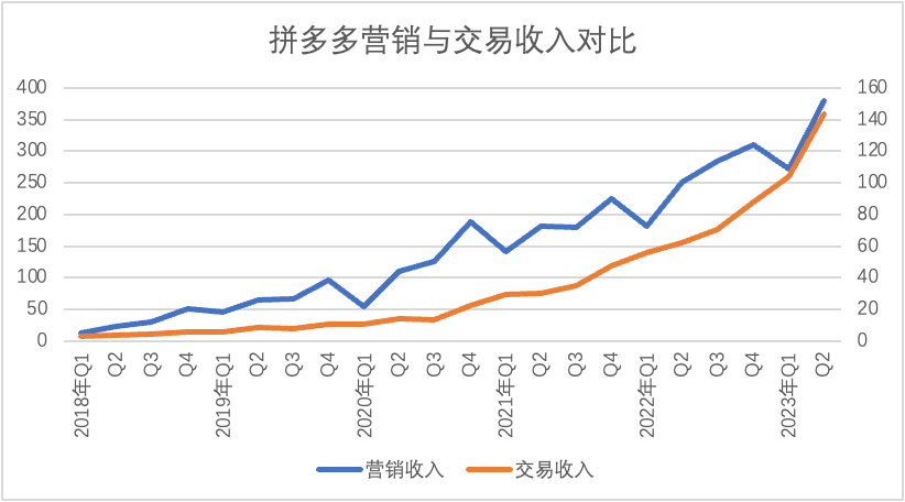 上图基本验证了前文观点,自2021年开始,随着社区团购(多多买菜)业务的推出和成长,拼多多交易收入旋即进入增长快车道(斜率陡增),相比之下营销类收入增长则在特殊的宏观经济背景下开始放缓(2021年尤其明显),2022年之后,两条折线斜率又同步上行。