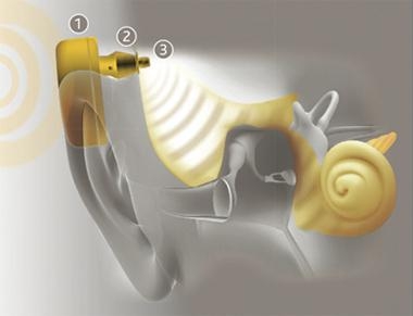 这是振动声桥技术。大概的原理是在内耳耳蜗处,有一个金属振动子,代替中耳三块听小骨进行传声。