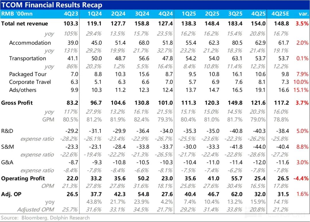 今早 2 月 26 日早美股盘后,处在监管阴云下的携程公布了 2025 财年 4 季度财报,整体来看,业绩表现不算差,营收增长全面好于此前指引、继续加速;但是经营费用支出也全面走高,增长比营收更快,导致 GAAP 经营利润反不及预期,具体来看: