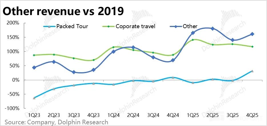 各业务线的营收增长全面好于此前指引,也都在加速。具体来看,规模较大的酒旅和票务收入表现相对稳健,略好于预期。反而是商旅、打包游和广告&其他三个 “小” 业务是营收超预期的主要原因。