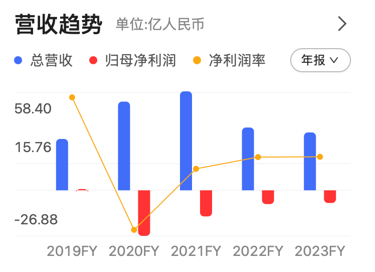 2021年之后,其经营情况甚至开始每况愈下,尤其到了2022年营收暴跌至谷底,直接从2021年的58.4亿元降低到37亿元,而2023年营收又进一步下滑。