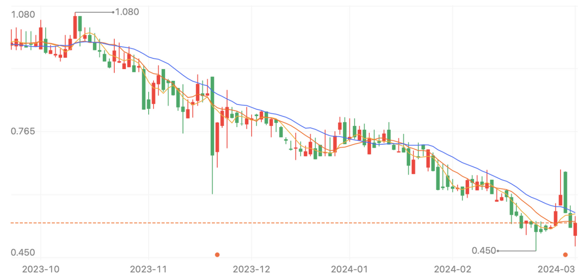 更为致命的是,就在业绩发布后的这两天时间里,逸仙电商股价一直处于跌跌不休之势,目前股价仅约为0.5美元/股,总市值不到3亿美元,远低于纳斯达克对上市公司股价1美元的要求,这也让逸仙电商于去年11月收到纽交所的警告后,不得不再次面临被强制退市的风险。
