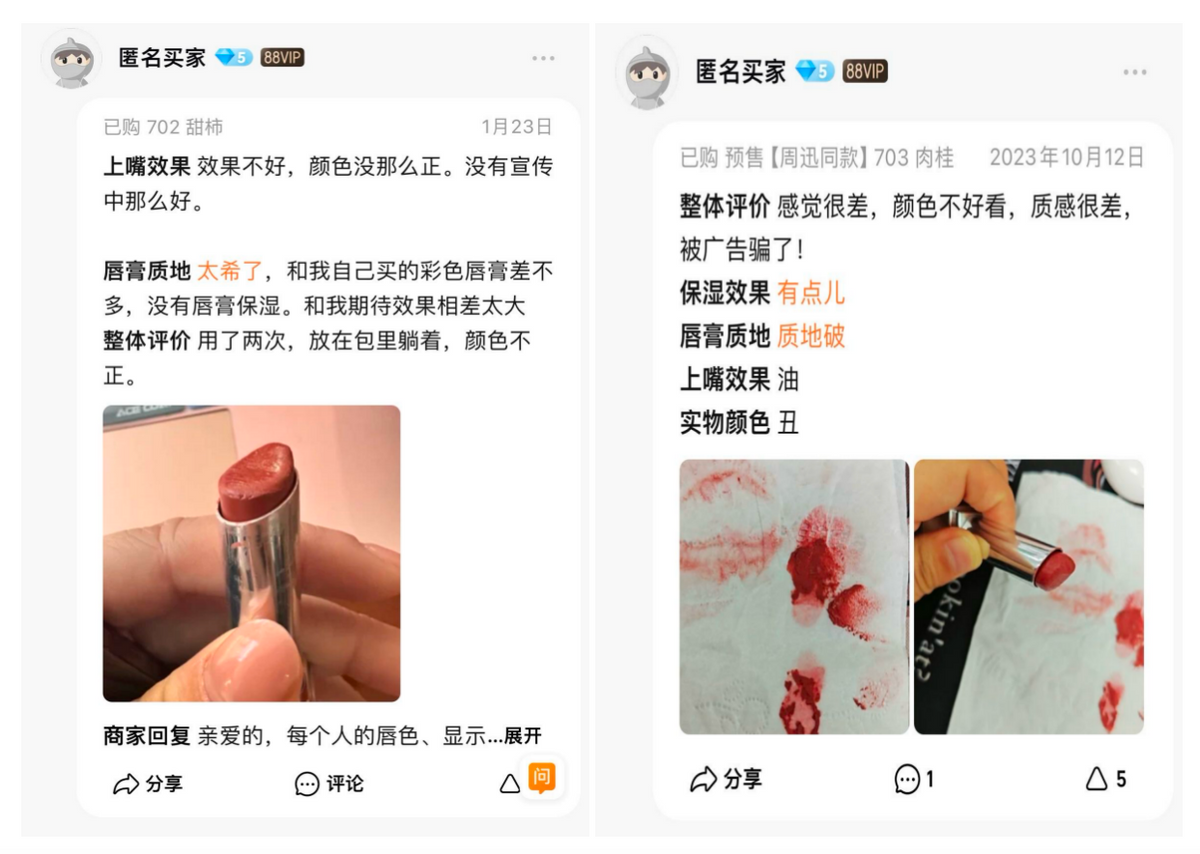 然而,就目前情况来看并不乐观。比如,小红书上就有一些用户反映,感觉被品牌方忽悠了,“仿生膜”精华口红说是能润唇,其实就是黏黏糊糊,颜色还会卡在唇纹里。而在一些电商购物平台上,该款口红的负面评价比比皆是,效果似乎并没有宣传的那么好。有消费者直接炮轰:“唇膏质地太希了,和自己买的彩色唇膏差不多,没有唇膏保湿,和期待效果相差太大,用了两次,放在包里躺着,颜色不正。”
