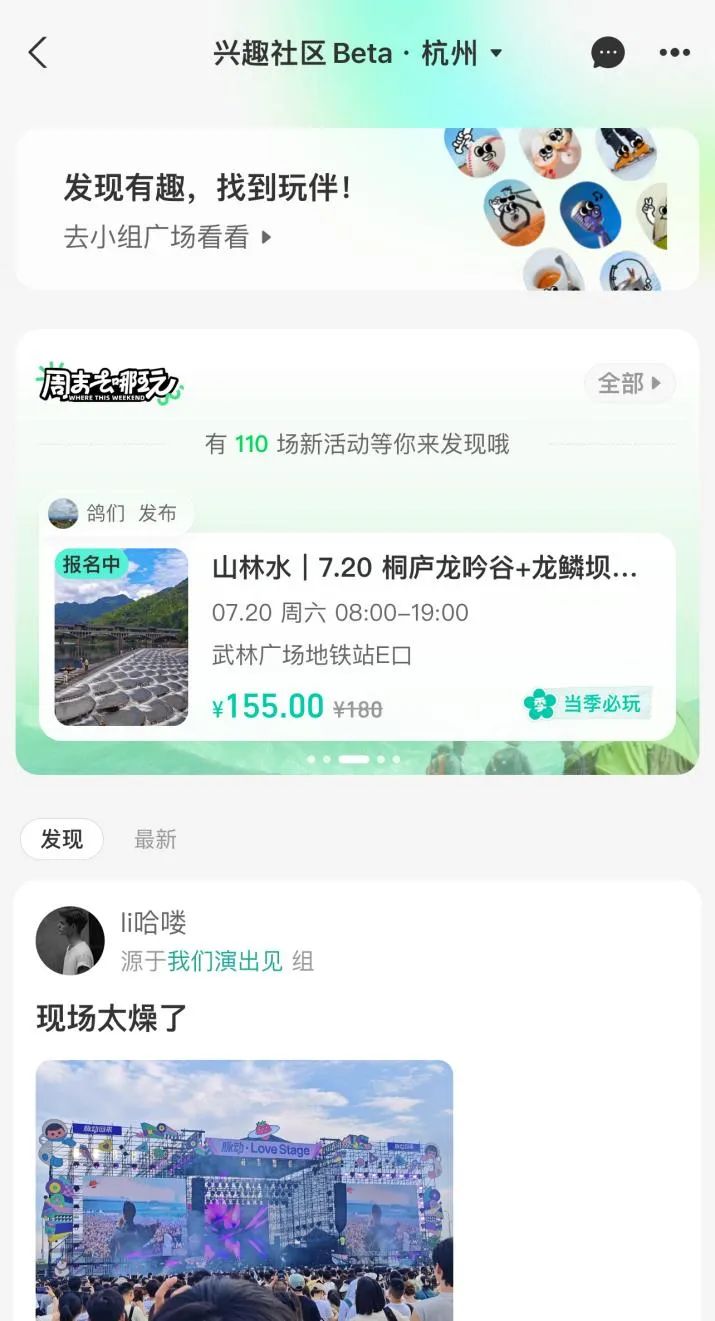 去年8月,支付宝推出“灯火”平台,正式推进流量变现。今年年初,支付宝还内测了一个名为“兴趣社区”的社交功能(目前只支持杭州),主要为用户提供基于兴趣、热门活动的小组社交,类似豆瓣的同城活动。