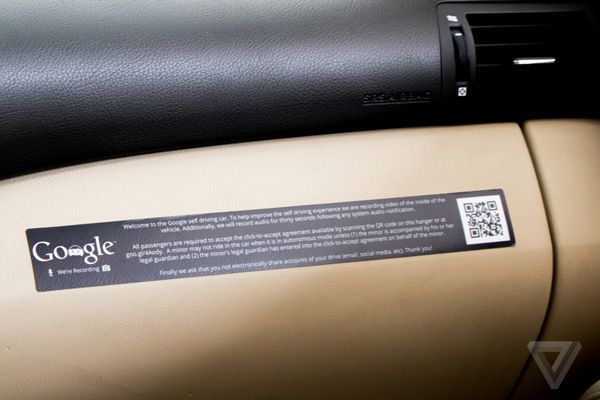 作为测试的一部分,谷歌一直都会对测试车辆的内部情况进行录像,同时也会保存部分音频。这些都在仪表盘的中间进行了说明。谷歌还会要求乘客接受限制责任的服务条款。