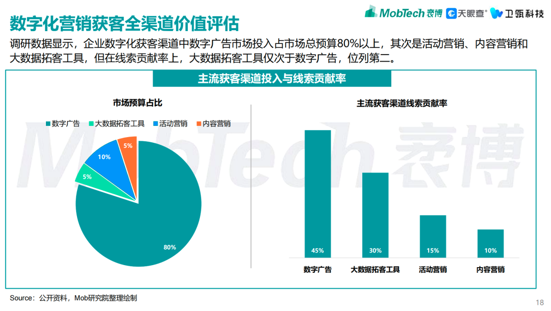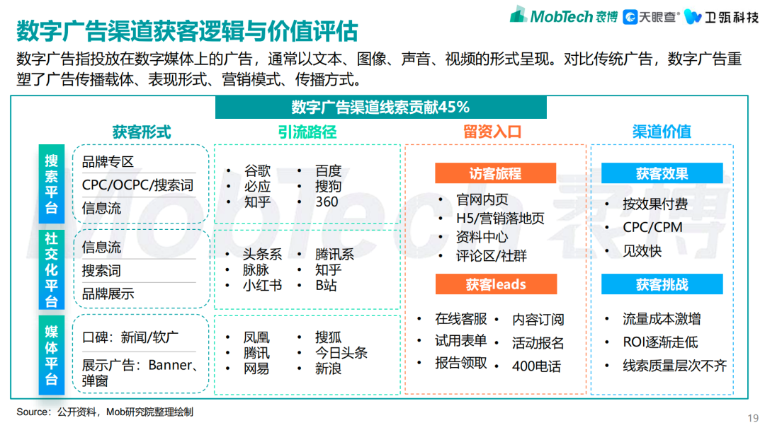 MobTech在一份研报中指出,近几年,数字广告渠道的线索贡献量占比已经来到了45%。