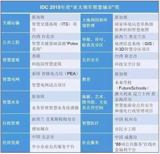 国际知名数据公司IDC去年也公布了2015年度“亚太区领军智慧城市项目”奖,其中新加坡是此次评选最大赢家,共有4项获得了2015年度亚太区智慧城市项目。(图片来自IDC)