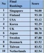 在2013年全球政府信息化排名,新加坡居榜首,这项由日本早稻田大学发起的年度评比中,新加坡、芬兰、美国分列本次排名的前三位,韩国第四位,第五则是英国,到如今新加坡在电子政务方面排名世界第一。