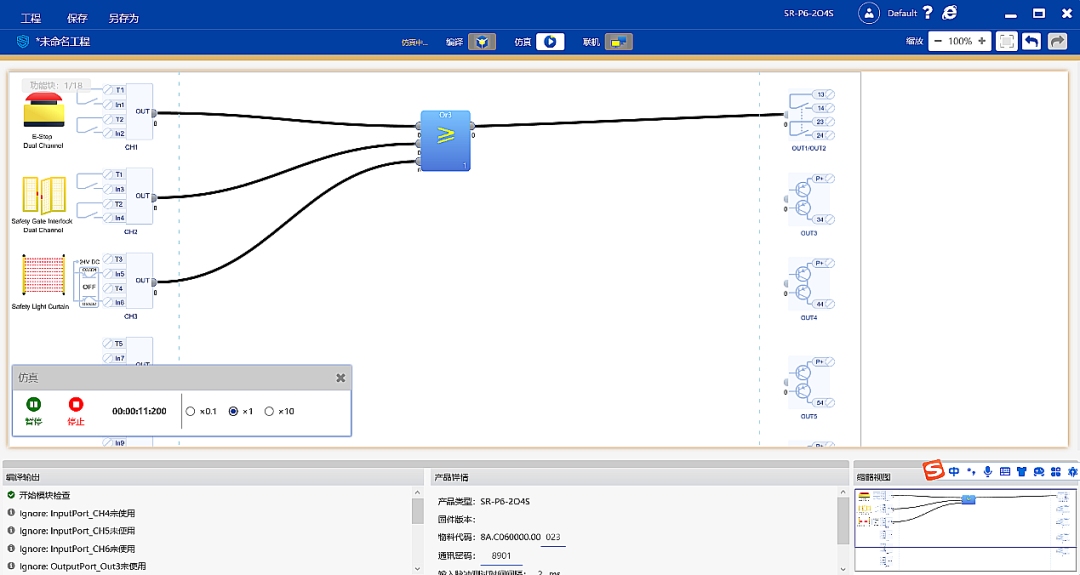 新款SR-P可编程安全继电器可同时接入3-10组安全输入,由于接入的安全输入,对于的安全功能要求不同,我们可以使用湾测SafetyEditor编程软件编辑拖动不同安全功能块,通过可视化列表菜单和鼠标拖拉的操作来选择安全逻辑功能。即使刚接触的安全工程师也能快速轻松的实现编写专用的安全程序,后面仿真实现逻辑功能输出。