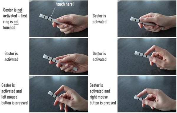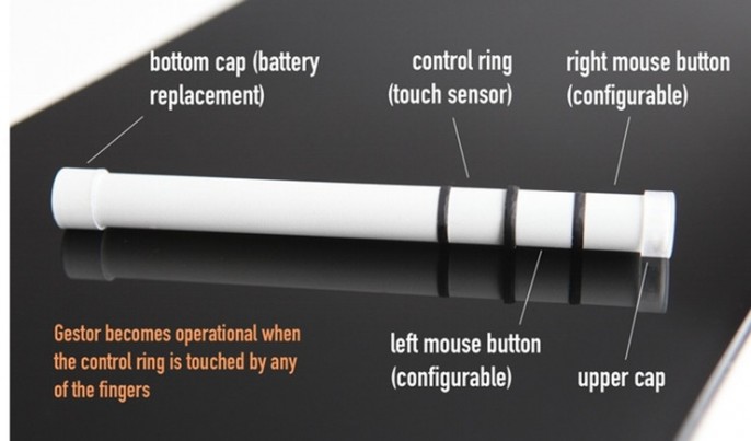 Gestor是一款可凌空操作的棒式鼠标,长133mm,直径14mm,适用于大多数人的手掌。上面有三个环形键,从下往上分别是控制键、左键和右键,均带有触控感应器。使用时,轻轻触摸第三个环形键即可启动鼠标,屏幕上的光标便会跟随鼠标的移动而移动。