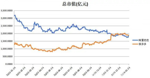 其次是财报。2023年底,“拼多多市值超越阿里和京东”的消息搅动了传统电商一池春水。虽然话题很有热度,业内外纷纷向拼多多发来“贺电”,但是回到三家传统电商其时的财报上,他们或许并不想“如此招摇”。