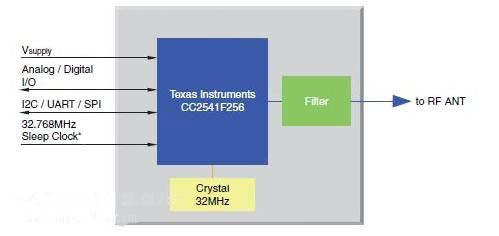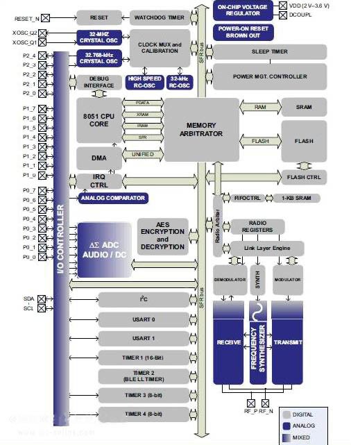 6×6毫米SOC(图2),集成了一个广泛的其他功能和特性的列表,其中包括一个8051单片机,一个天生的格式和协议栈,相当大的内存,三个定时器,23日通用I/O(GPIO)针,一个八通道A/D转换器,一个看门狗定时器,一个电池监视器,一个温度传感器,和I2C/SPI和UART接口。设备的目标,但不能保证按时按量服药等全球无线电频率规定ETSI EN 300 328和EN 328(欧洲),FCC CFR47 15(美国)的一部分,还有STD-T66(日本)。