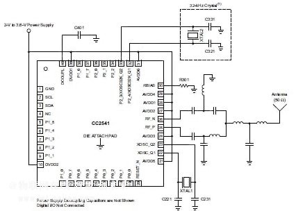 随着IC,TI提供一系列的产品开发工具,如评估模块工具(CC2541EMK),一个迷你开发工具包(CC2541DK-MINI),SmartRF软件等等。的典型应用电路CC2541(图3)显示了所需的外部组件。