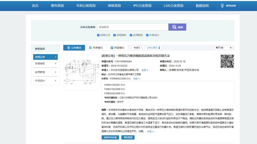 2月18日,雷达财经通过查询国家知识产权局发现,日出东方取得一项名为“一种带压力维持阀的高温热泵开机控制方法”的专利,申请公布号:CN119468559A,申请日期为2024年10月29日,申请公布日是2025年2月18日。