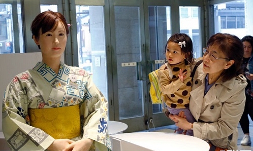 日前,日本东京三越百货启用了一位名叫地平爱子(Aiko Chihira)的迎宾机器人。据介绍,这款机器人由东芝开发,它会自动招呼顾客,依照预设的话语、动作来发声、行动,用来做简单的导引、介绍等。