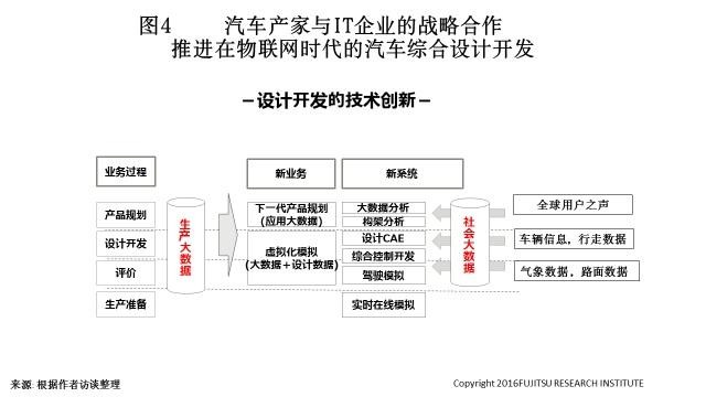 汽车行业是日本的支柱产业,同时也是工业4.0/IIoT的最佳实践对象行业。日本各大汽车企业利用原有自动化程度高,生产技术创新活跃的优势,大力推动大数据、物联网、云服务、智能化的开发和应用。如图4所示,目前日本汽车产家都开始探索生产大数据及社会化大数据在开发、设计中的应用。