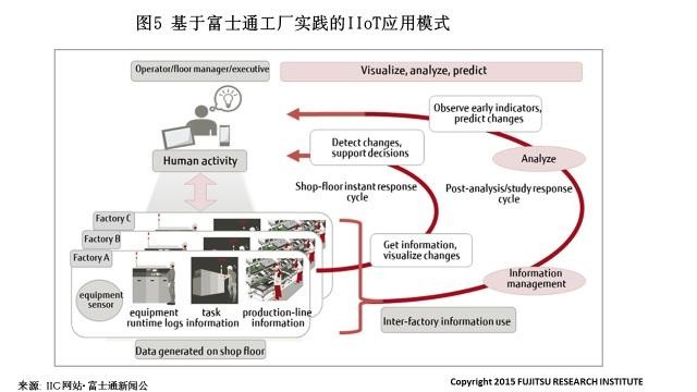 除制造业、服务业等行业致力于物联网的应用,推动与网络的融合以外,IT企业也结合自身优势提出众多应对工业4.0/工业物联网(IIoT)的冲击解决方案。如富士通公司除积极参与美国GE/IBM等倡议的工业互联网联盟(IIC: Industrial Internet Consortium)成为IIC标准与工程组总监外,基于自身的工厂实践提出了IIoT应用模式: “工厂可视化”试验平台FOVI。
