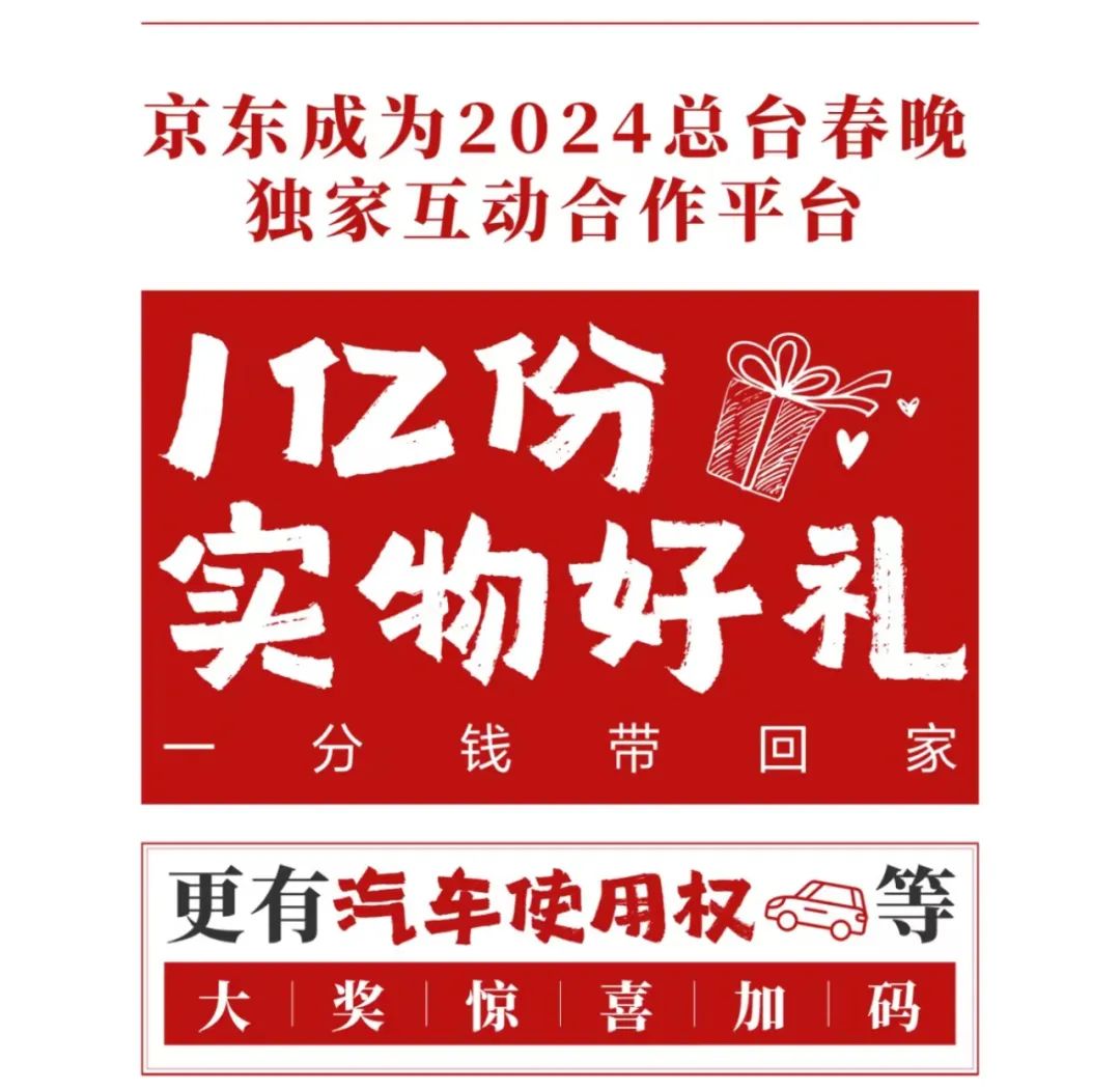 1月24日,京东正式官宣成为2024年央视春晚的独家互动合作平台,将以抽奖互动形式送出一亿份实物奖品,还有汽车使用权等大奖加码。