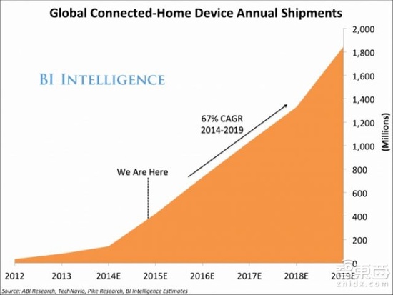 根据BI分析,2015至2019年间,物联化智能家居出货量的年复合增长率(CAGR)将达67%,预计2019年总计会有1.8亿台产品面世,完全刷新了智能手机和平板创造的超高增长速度历史。