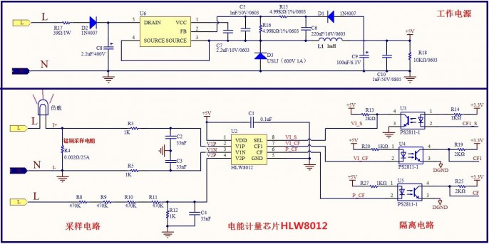 ·HLW8012外围电路简单,主要包括电流、电压的采样。电流信号通过锰铜电阻对负载电流进行采样,电压信号通过电阻网络分压采样,元器件少,且HLW8012集成RC震荡器、参考电压,SOP8封装,电能计量部分体积可以很小。