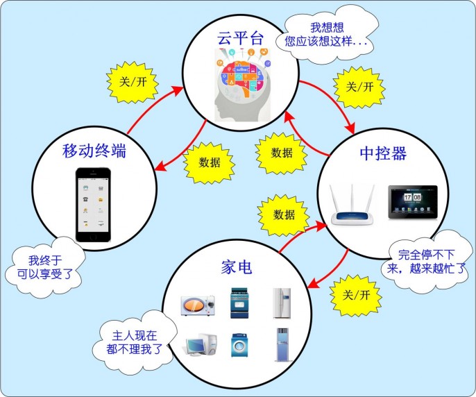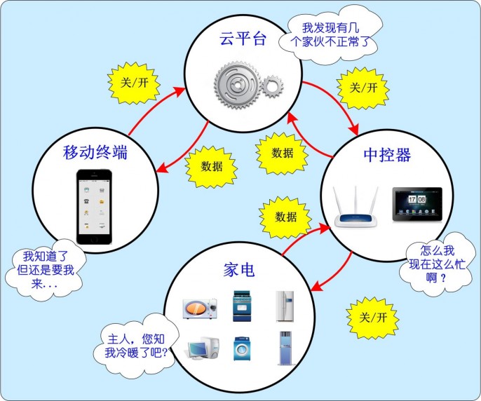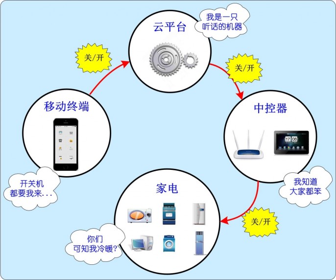 第一阶段:使用移动终端进行远程控制。此阶段,实现家电的控制主要依靠人为干涉,是一个开环系统,能远程控制,但不能获得家电的自身数据,不能自动控制等。