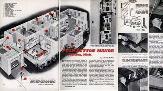 1950年,机械奇才Jackson提出了一个被称为“按钮庄园(Push-Button-Manor)”的智能家居概念,他在设计中使用了一个按钮来控制所有的设备,比如风电咖啡研磨机、智能梳妆台和智能窗户等等。