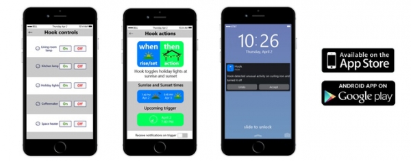 这套智能家居系统这就是 HOOK,美国的四人硬件开发团队开发了这款产品。HOOK 套件内包括一个 RF(射频/无线电)-WiFi 核心控制器和可扩展的插头转换器、卡口转换器、USB转换器,核心控制器以 WiFi 模式联网与 IFTTT 协同,以 315MHz – 433MHz 频段的无线电模式与插头转换器和卡口转换器通信。