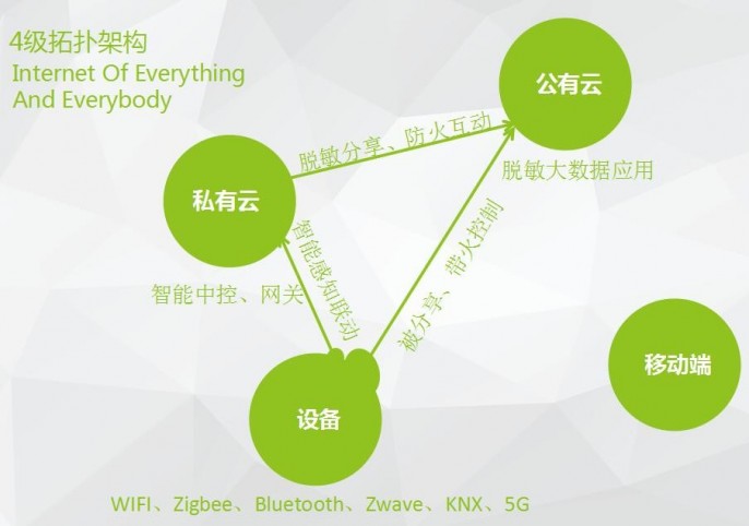 现在很多互联网企业,强调建设公有云。何家平总监强调,“我们的传感器等设备通过智能中控、网关传送数据通过私有云脱敏分享(脱敏指对某些敏感信息进行数据变形,实现敏感隐私保护)数据到公有云。移动端是跟着用户一起走的终端,无时无刻的产生数据链接,而我们的方案则是提供通路,强化内部私有云的管理。”